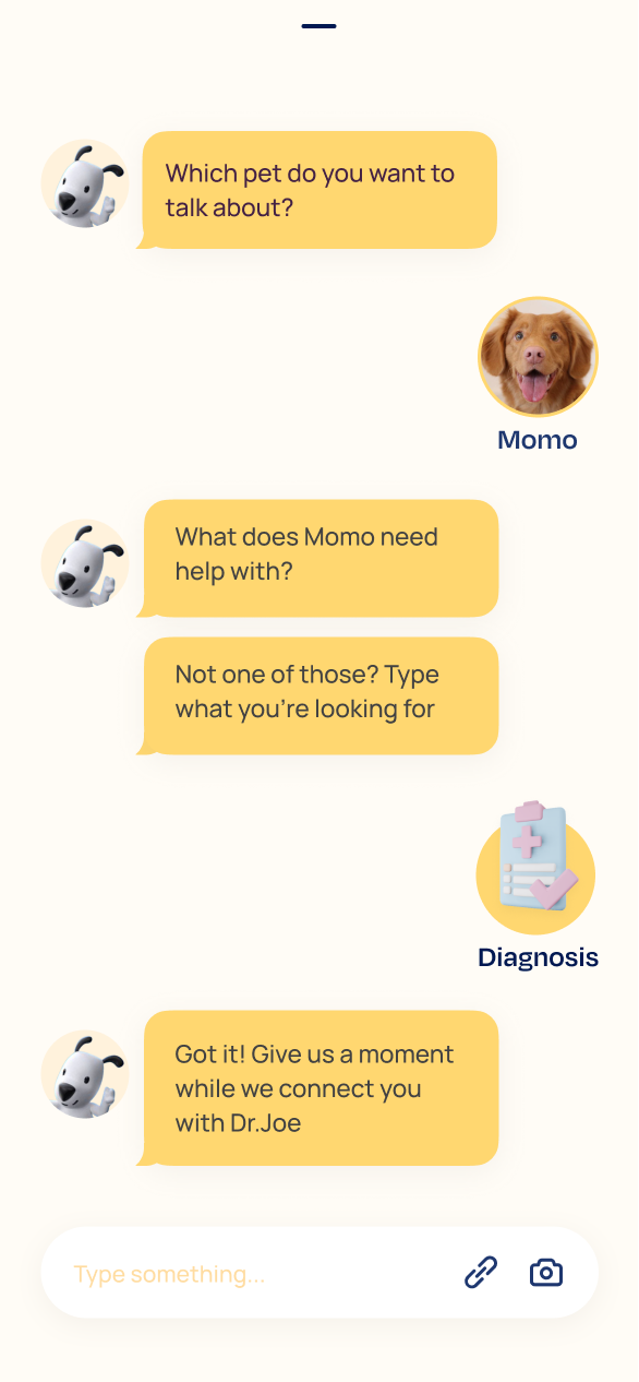 An AI chatbot to give a brief diagnosis of your pet to decide if your pet needs an in person visit or virtual appointment