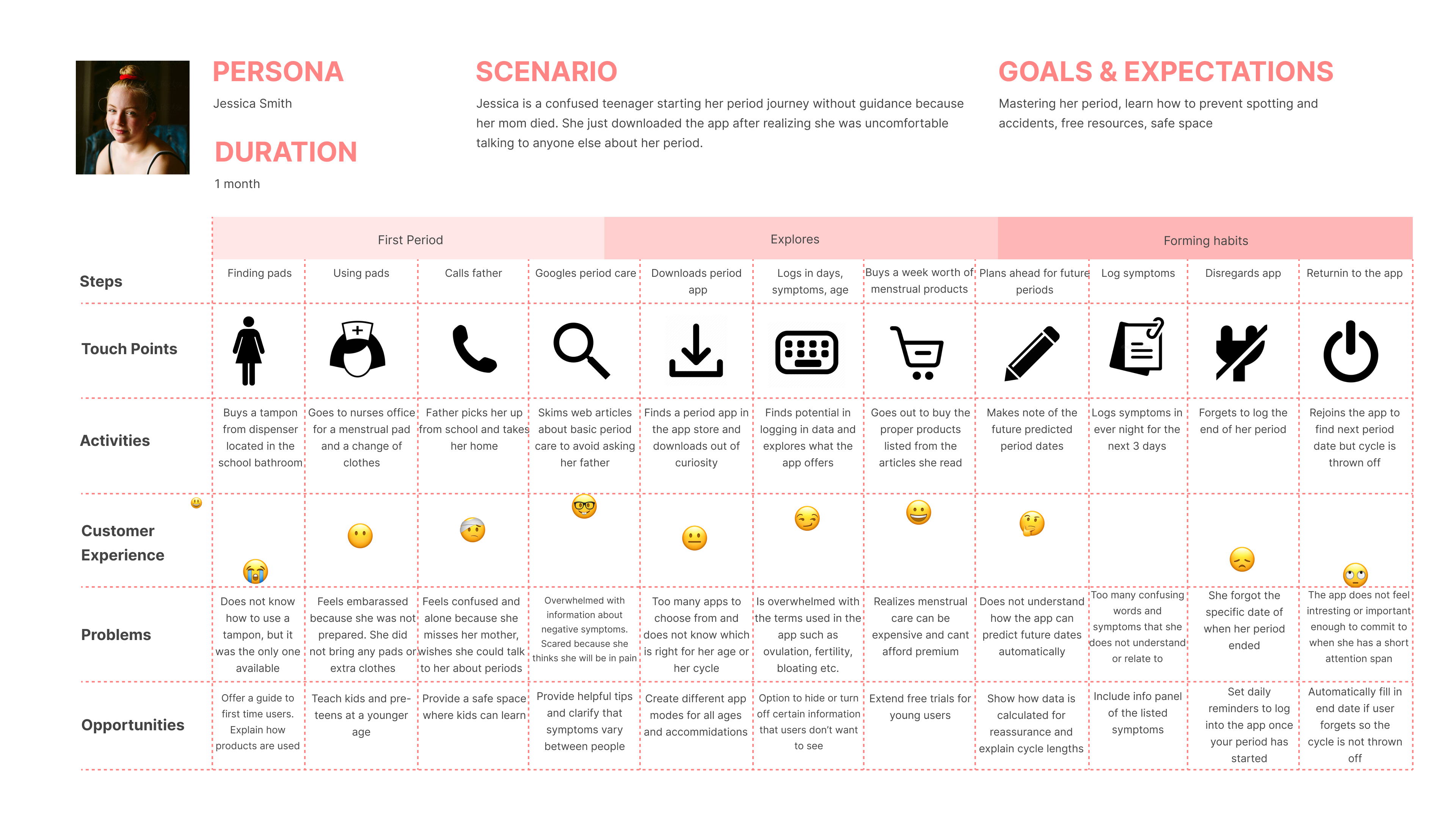 Jessica is a confused teenager starting her period journey without guidance because her mom passed away. She needs an open space where she can learn without feeling uncomfortable