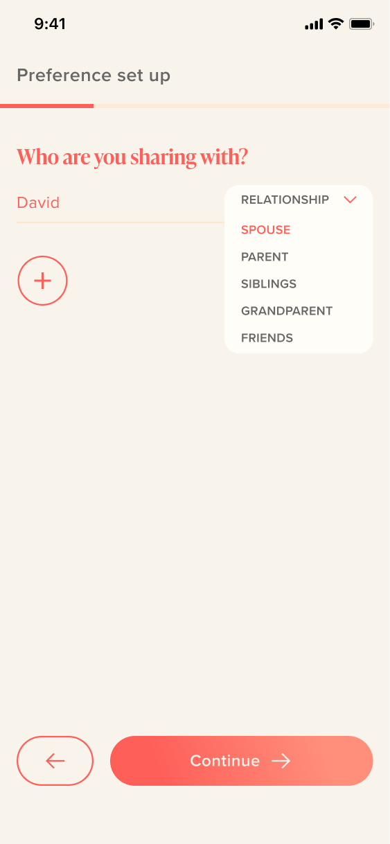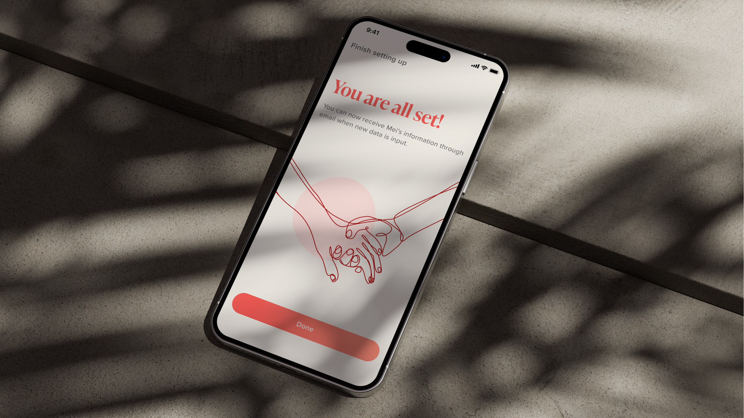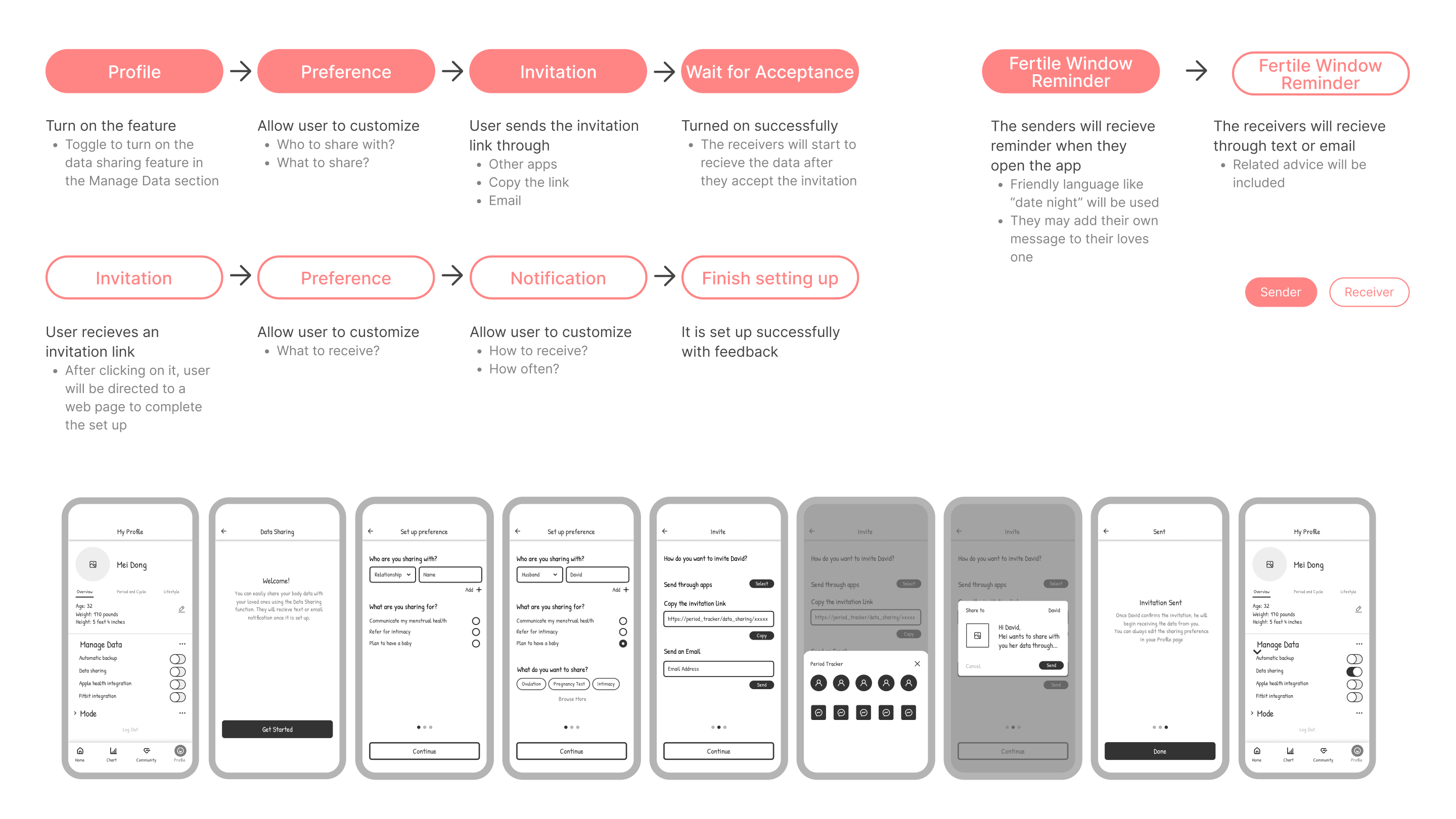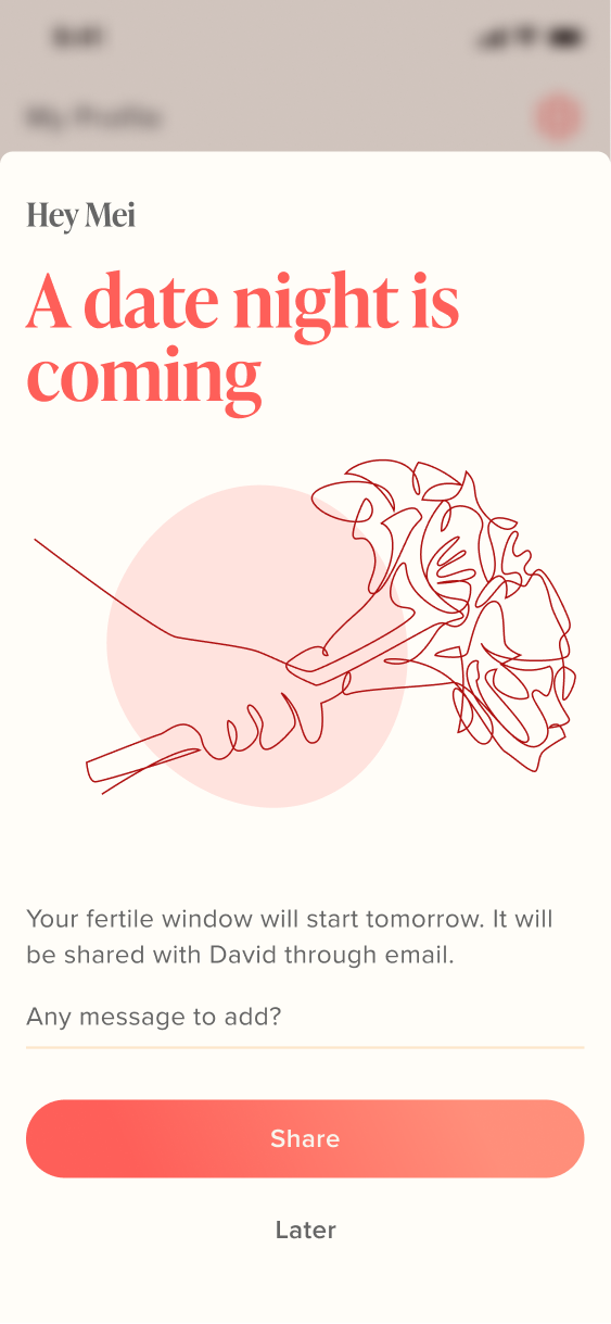 Mei wants to communicate her fertile window date with her husband, David. She is setting up the data sharing features in the app.