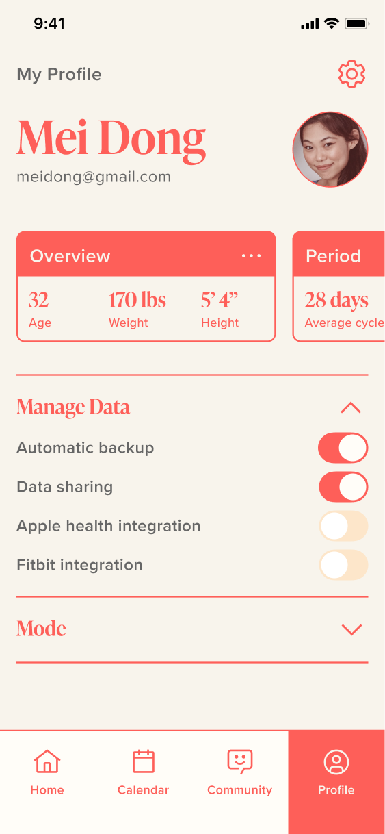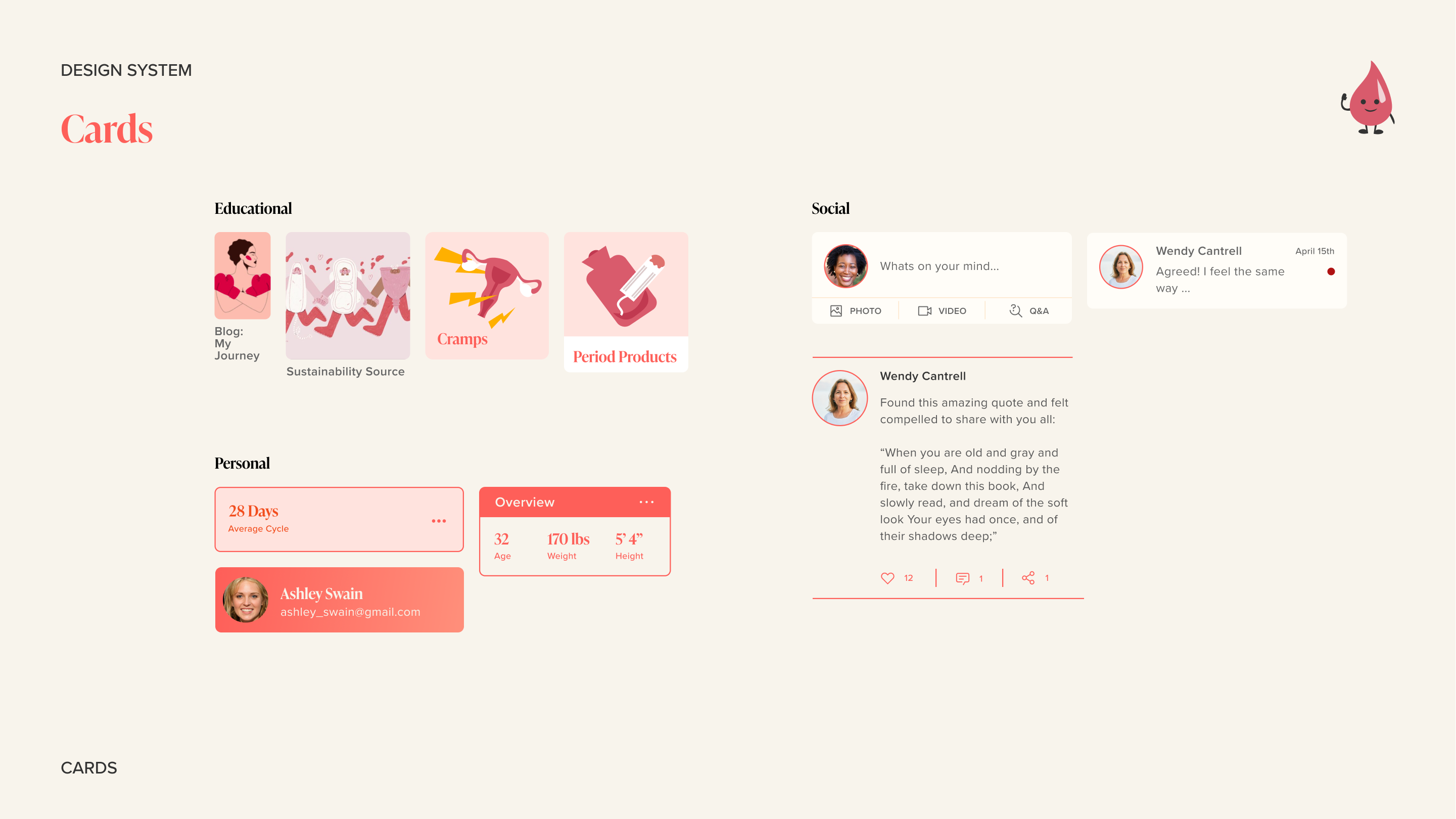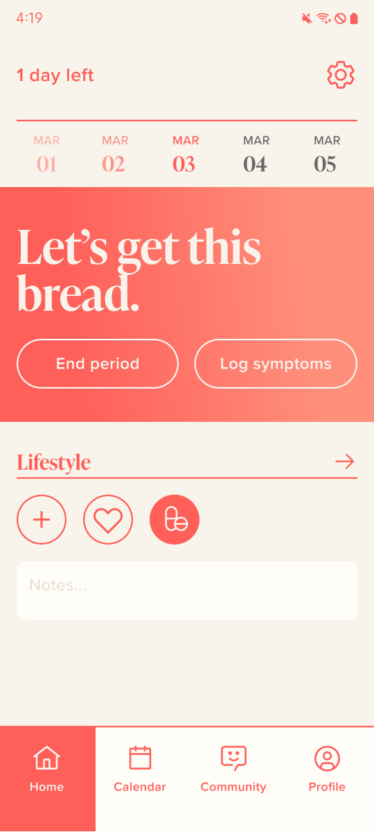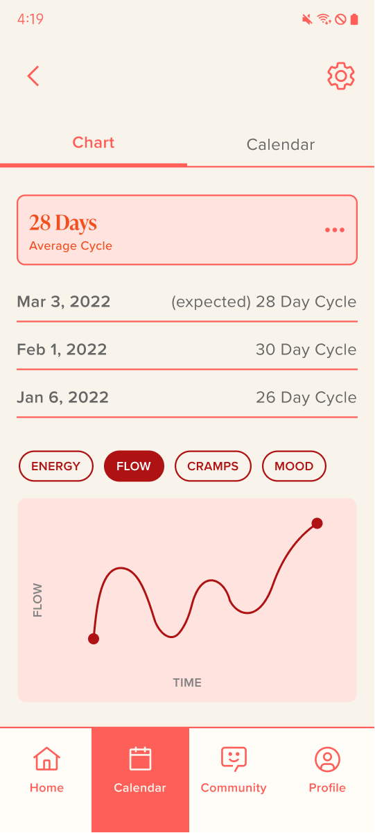 The purpose of the Period Tracker’s visual identity is to evoke a feeling of safety. The app uses a blend of warm tones to further capture the comforting atmosphere.